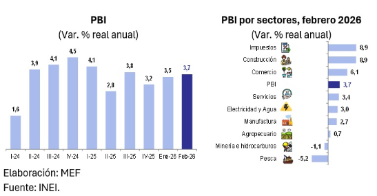 · El PBI creció 3,7 % en febrero, por encima de lo registrado en enero (3,5 %), y acumuló 23 meses consecutivos de expansión. En el primer bimestre de 2026, la economía avanzó 3,6 %.