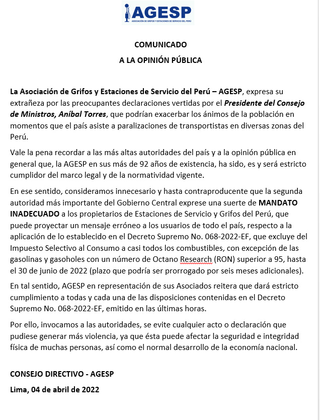 La Asociación de Grifos y Estaciones de Servicio del Perú – AGESP, expresa su extrañeza por las preocupantes declaraciones vertidas por el Presidente del Consejo de Ministros, Aníbal Torres, que podrían exacerbar los ánimos de la población en momentos que el país asiste a paralizaciones de transportistas en diversas zonas del Perú.