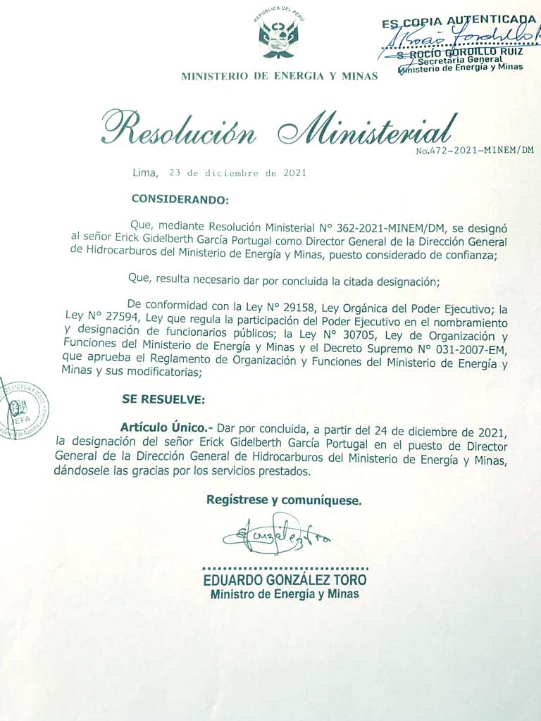 Tras una dinámica labor al frente de la Dirección General de Hidrocarburos (DGH) y el FISE, Erick García Portugal, dejó el cargo. Mediante Resolución Ministerial N° 472-2021 Minem/ DM del 23 de diciembre 2021 se deja sin efecto la encargatura de confianza y en tanto se designe a nuevo director de la DGH, se encarga esta función a Denis Joel tapia Rodríguez, actual Jefe de la Oficina General de Planeamiento y Presupuesto.