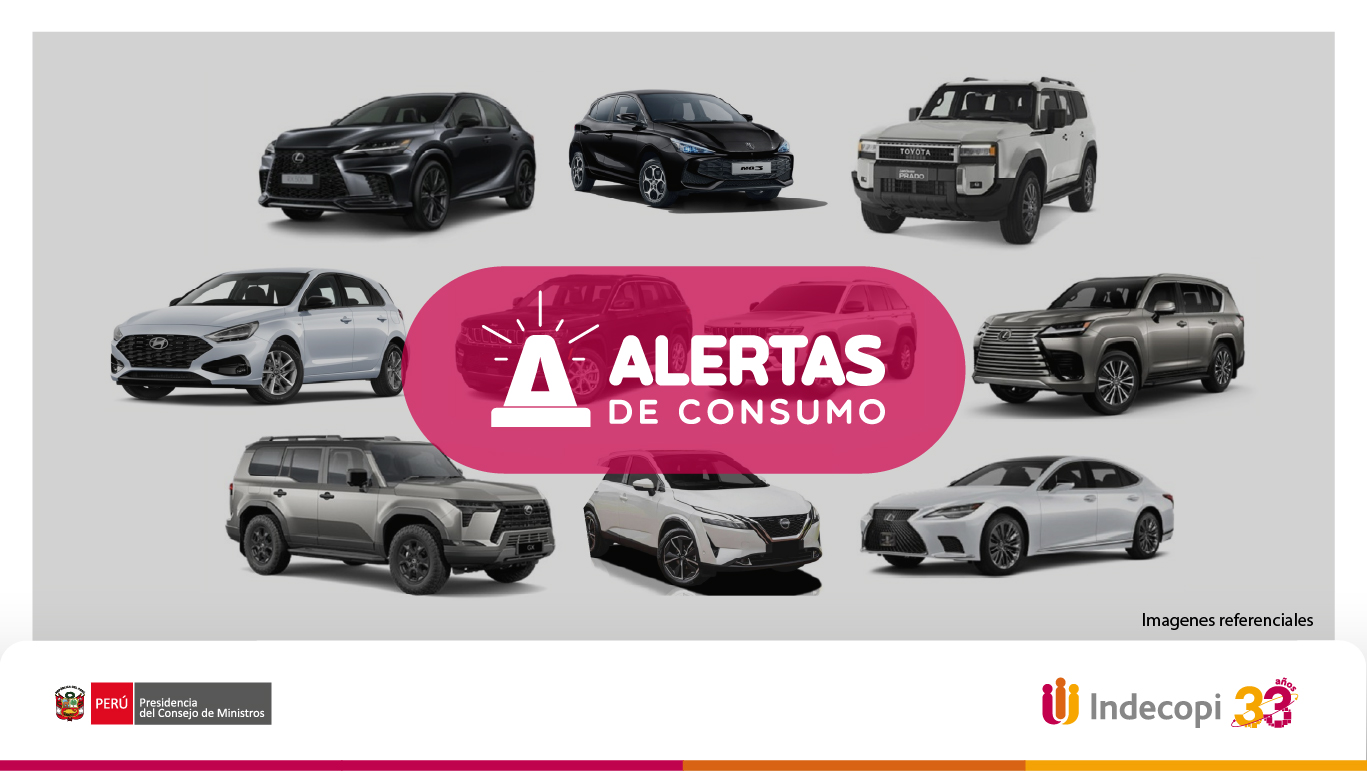 Indecopi informa que diversas empresas automotrices revisarán distintos modelos de vehículos para prevenir posibles riesgos para los consumidores. Nissan Perú S. A. C. reportó la revisión de 1081 vehículos Nissan Qashqai (J12), fabricados entre 2023 y 2024 en Inglaterra, por un posible desgaste en la tubería de combustible que podría generar una fuga y, eventualmente, un incidente térmico. Los propietarios pueden verificar si su vehículo está afectado en www.nissan.pe/recall.html. Alerta disponible en este enlace.