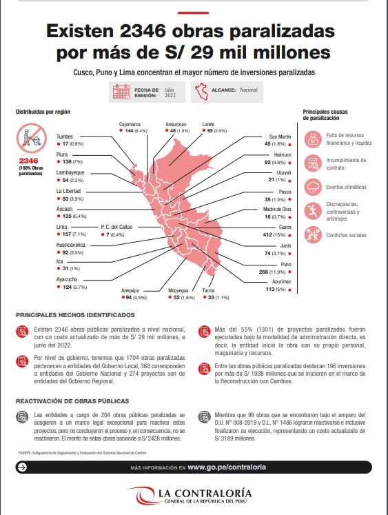 La Contraloría General reveló que existen 74 obras públicas paralizadas a nivel regional, con un costo actualizado de más de S/ 1 mil millones, al 30 de junio del 2022. Además, es preciso indicar que hay un saldo de inversión de S/ 497 millones 533, mientras que el saldo de obras supera los 396 millones de soles. Ésta data está actualizada hasta el 30 de junio de este año (Infobras)