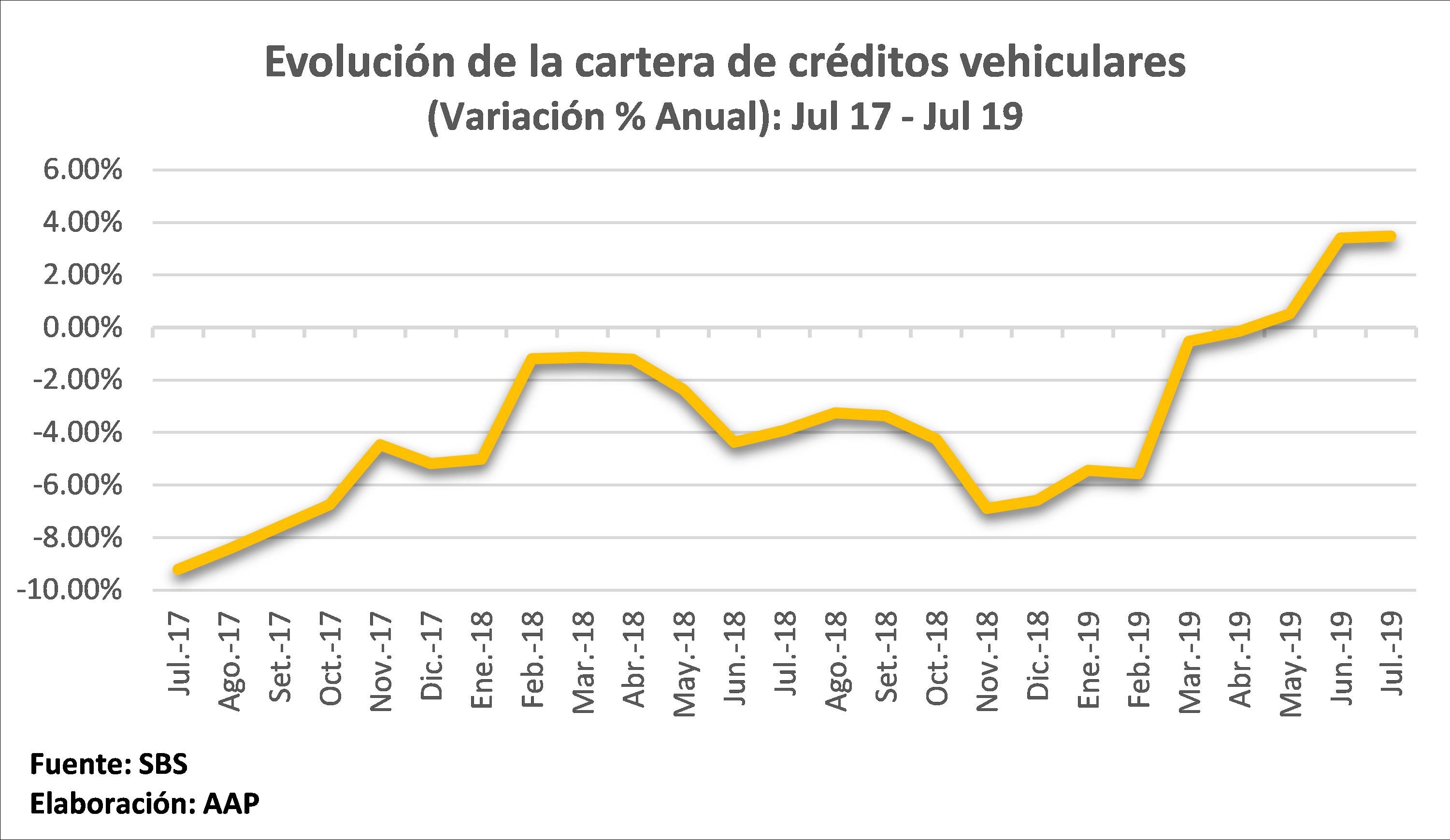 Los créditos vehiculares otorgados por la empresas bancarias registraron un saldo de S/ 1,838 millones en julio, poniendo en evidencia un crecimiento de 3.48%, respecto a similar mes del 2018[1], informó la Asociación Automotriz del Perú (AAP). Es importante señalar que la referida expansión fue mayor al 3.41% reportado el mes anterior.
