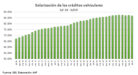 De otro lado, el índice de solarización -indicador que mide la participación del financiamiento en soles en el portafolio de créditos vehiculares- fue de 86.96% al término del sétimo mes del 2019, y aumentó en 2.96 puntos porcentuales en relación a julio del año pasado. Es importante destacar el significativo avance de dicha variable, de casi 20 puntos porcentuales en tan solo tres años.
