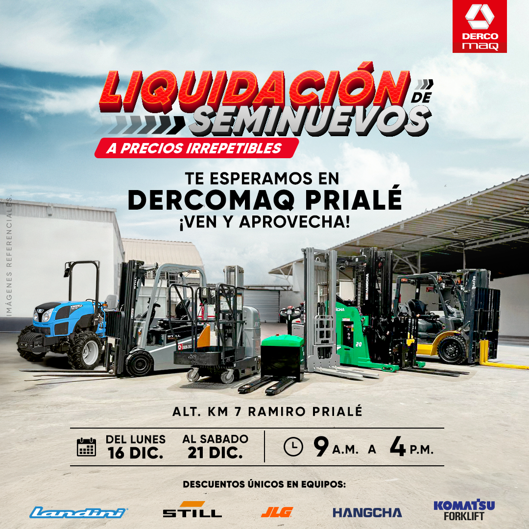 La feria se realizará del 16 al 21 de diciembre en la sede de Dercomaq Prialé, ubicada en el km. 7 de la Autopista Ramiro Prialé. Contará con más de 100 equipos seminuevos de prestigiosas marcas como Landini, Still, Hangcha y Komatsu, con descuentos exclusivos y precios irresistibles.