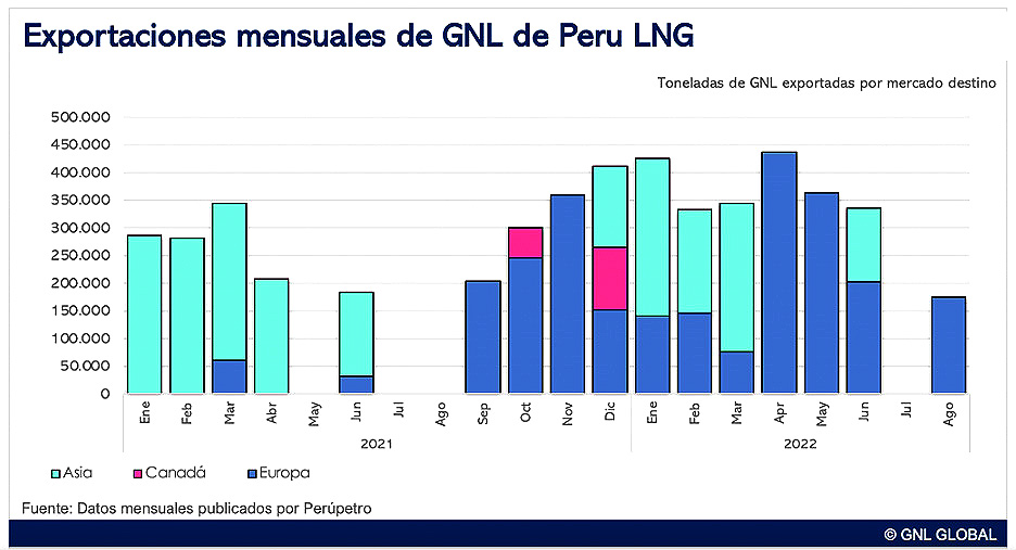 De acuerdo con las cifras de PeruPetro, durante los primeros ocho meses de 2022, la instalación peruana de GNL envió un total de 1,54 Mt a Europa, de los cuales, el 95% o 1,46 Mt fue enviado al Reino Unido.