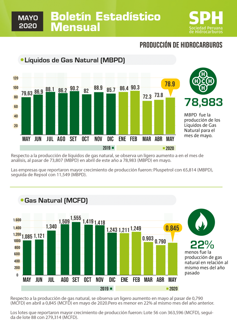 El gas natural registra un ligero aumento en su producción al pasar de 0,790 (MCFD) en abril a 0,845 (MCFD) en mayo de 2020.Pero es menor en 22% al mismo mes del año anterior. Los lotes que reportaron mayor crecimiento de producción fueron: Lote 56 con 363,596 (MCFD), seguido del lote 88 con 279,314 (MCFD).