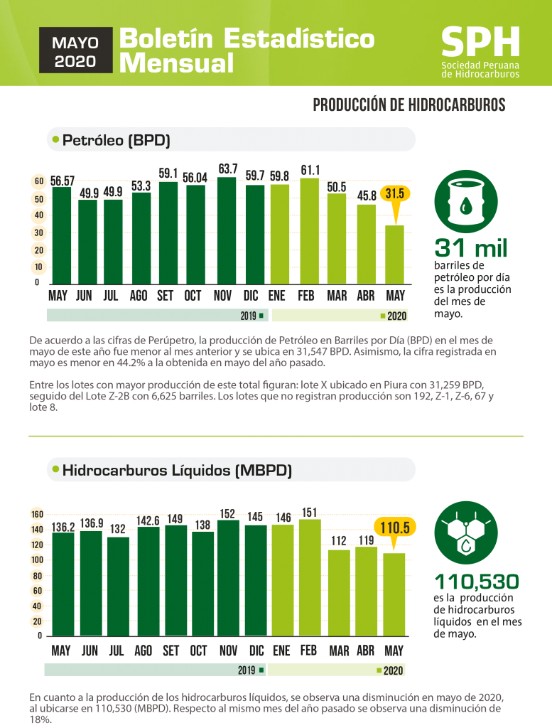 Producción de petróleo cae | La producción de Petróleo en Barriles por Día (BPD) en mayo de 2020 se ubicó en 31,547 BPD lo que significó una caída de de 44.2% en relación al mismo mes del año pasado. Respecto a abril de 2020 también hay una significativa caída. Entre los lotes con mayor producción de este total figuran: lote X ubicado en Piura con 31,259 BPD, seguido del Lote Z-2B con 6,625 barriles. Los lotes que no registran producción son 192, Z-1, Z-6, 67 y lote 8.