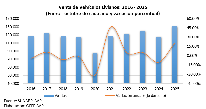 De acuerdo con cifras oficiales de la Superintendencia Nacional de los Registros Públicos (Sunarp), en octubre se comercializaron 16,632 vehículos livianos nuevos, cifra que representa un crecimiento interanual de 26.8%, el volumen más alto registrado desde enero de 2013. En el acumulado de enero a octubre, las ventas sumaron 152,026 unidades, lo que significa un incremento de 20.6% respecto al mismo periodo de 2024, superando incluso todo lo vendido durante el año pasado.
