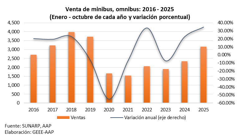 Asimismo, la venta de minibuses y ómnibus mostró un aumento de 25.4% en octubre, con 321 unidades vendidas, y un total acumulado de 3,162 unidades (+34.7%). Este resultado se vincula con la recuperación de actividades como el turismo, la hotelería y el entretenimiento, que han retomado dinamismo tras años de contracción.