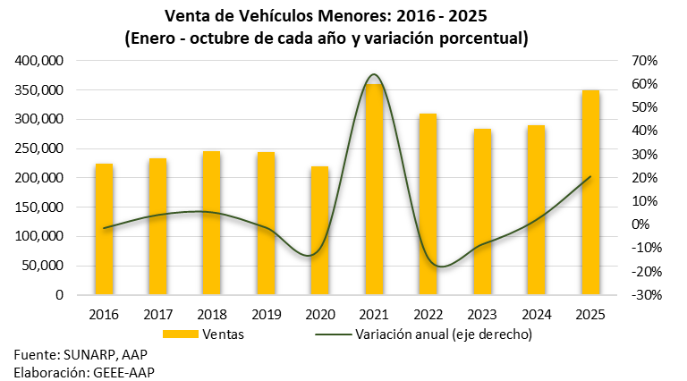 En cuanto a vehículos menores, las ventas también continuaron al alza. Durante octubre se comercializaron 40,875 unidades, un incremento de 28.5% frente a 2024, mientras que el acumulado de enero a octubre llegó a 349,958 unidades (+20.7%).