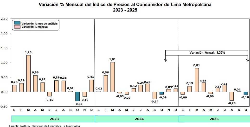A nivel nacional, el Índice de Precios al Consumidor registró una variación de -0.07% en octubre, con una inflación acumulada de 1.08% y una tasa anual de 1.29%. Las ciudades con mayor inflación anual fueron Ica (2.35%), Piura (2.12%) y Arequipa (1.85%), mientras que las menores se observaron en Huaraz (-0.22%), Cerro de Pasco (-0.33%) y Huancavelica (-0.90%).