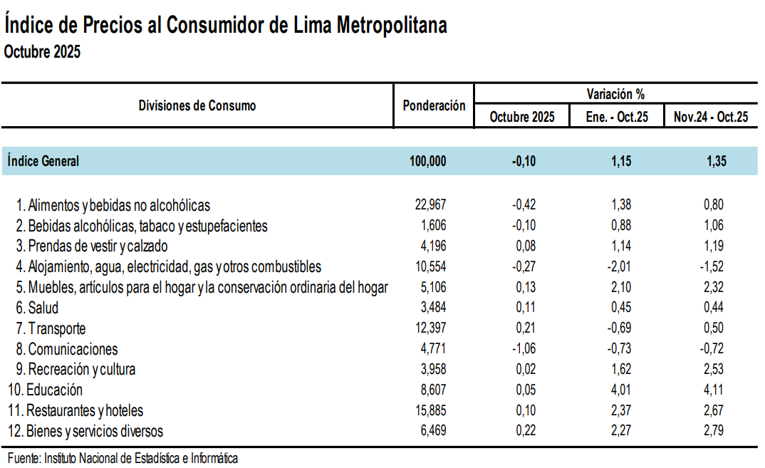 De acuerdo con el INEI, esta variación se explicó por la disminución de precios en divisiones como Comunicaciones (-1.06%), Alimentos y Bebidas No Alcohólicas (-0.42%) y Electricidad y Combustibles (-0.27%), mientras que Transporte (0.21%) y Restaurantes y Hoteles (0.10%) aportaron de forma positiva.