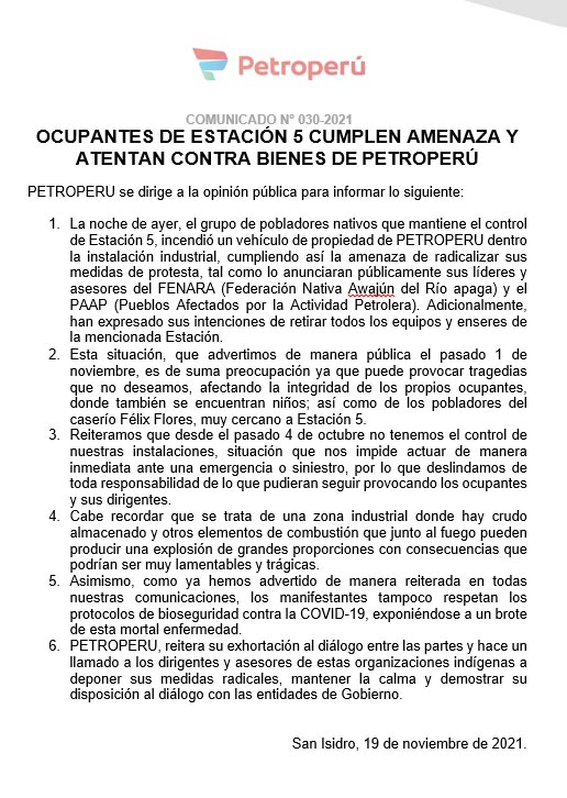- PETROPERÚ, reitera su exhortación al diálogo entre las partes y hace un llamado a los dirigentes y asesores de estas organizaciones indígenas a deponer sus medidas radicales, mantener la calma y demostrar su disposición al diálogo con las entidades de Gobierno.