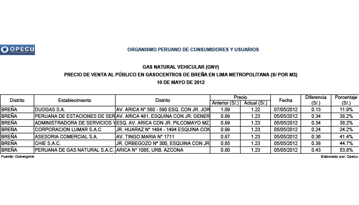 El Opecu presentó la relación de los 121 gasocentros de GNV en Lima Metropolitana que elevaron el precio de venta al público a S/ 1.23 por metro cúbico, entre el viernes cuatro de mayo y el jueves 10 de mayo de 2012.