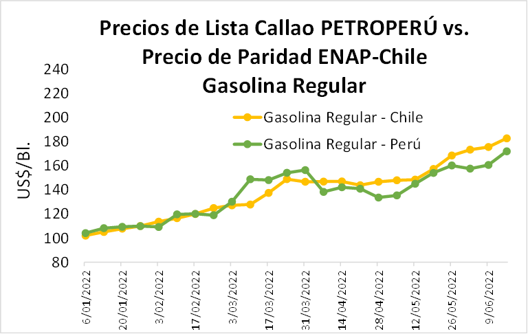 En el gráfico N° 1 se puede observar la tendencia en Perú y Chile para la Gasolina Regular, lo que en la lista de precios PETROPERÚ es similar a la de Gasolina 90: