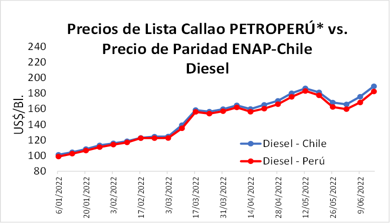 Precio de Lista PETROPERÚ vs. Precio Paridad de Importación Chile (sin impuestos)