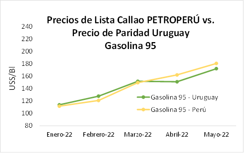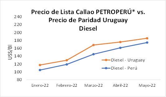 Precio de Lista PETROPERÚ vs. Precio Paridad de Importación Uruguay (sin impuestos)