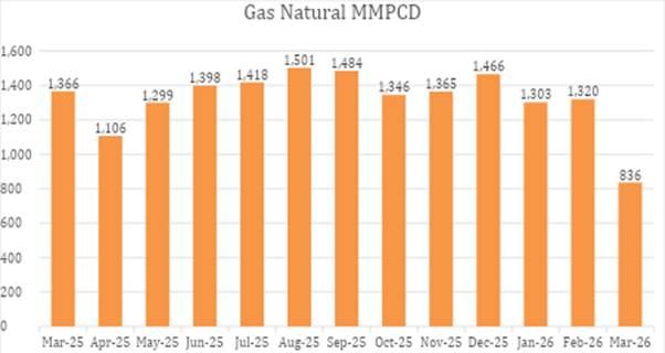 De otro lado, la producción de gas natural registró un promedio de 1,148 millones de pies cúbicos por día (MMCFD) durante el primer trimestre de 2026, lo que significó una caída de 10,2% respecto al primer trimestre del año 2025 cuando la producción alcanzó los 1,279 MMCFD.