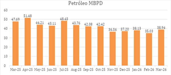 En detalle, solo en el mes de marzo de 2026, la producción llegó a 38.94 MBPD, mostrando una recuperación respecto a meses previos.