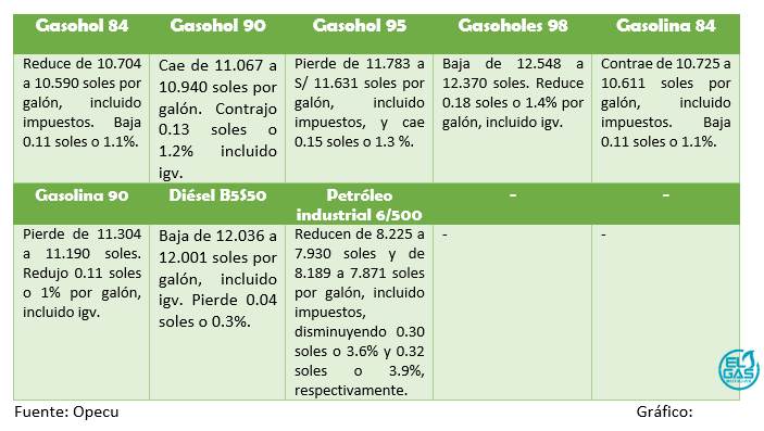 Opecu indicó ayer que la petrolera española Repsol publicó la nueva lista de precios de combustibles reduciendo los gasoholes, gasolinas, diésel y petróleo industrial hasta en 3.9 %, incluido igv, cuya vigencia rige desde el sábado 24 del 2019.