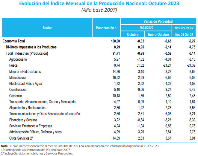 La economía peruana volvió a retroceder en octubre último, alcanzando su sexto descenso consecutivo y octavo del 2023, según informó el Instituto Nacional de Estadística e Informática (INEI). De acuerdo con el ente estadístico, el índice de actividad económica cayó -0.82% en octubre del presente frente a igual mes del año pasado. El INEI sostuvo que el resultado respondió a la menor producción registrada de los sectores: Construcción, Financiero, Agropecuario, Manufactura, Telecomunicaciones, Servicios Prestados a Empresas y Alojamiento y Restaurantes. Sin embargo, es importante señalar que los sectores Minería e Hidrocarburos, Comercio, Pesca, Electricidad Gas y Agua, Transporte y Otros servicios mostraron resultados positivos.