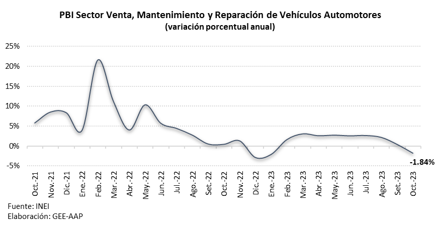 En cuanto al desempeño por actividad económica, el sector Comercio continuó desacelerándose y reportó un crecimiento de 1.36%, impulsado por los avances de los subsectores venta al por mayor en 1.54% y venta al por menor en 1.79%; sin embargo, el comercio automotriz sufrió una caída de -1.84%. Respecto a este último subsector, el resultado responde a la menor venta de vehículos y la desaceleración del crédito vehicular. De igual manera, se contrajo la comercialización, mantenimiento y reparación de motocicletas y de sus partes, piezas y accesorios; y la venta de partes, piezas y accesorios de vehículos automotores, como consecuencia de una menor demanda en el mercado e incremento de precios. Finalmente, descendió el mantenimiento y reparación de vehículos automotores por disminución de servicios de reencauche, mantenimiento y término de contratos con el sector privado.