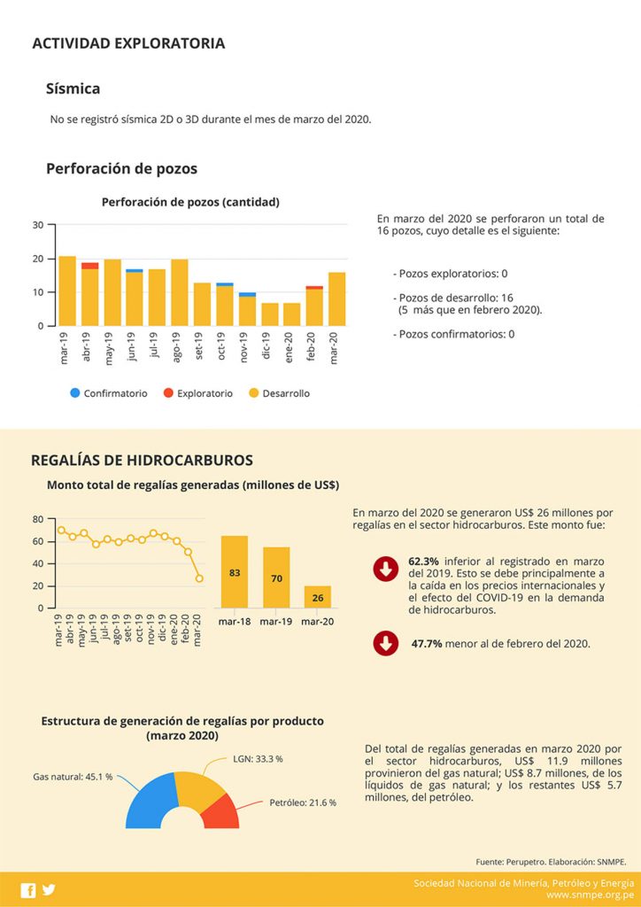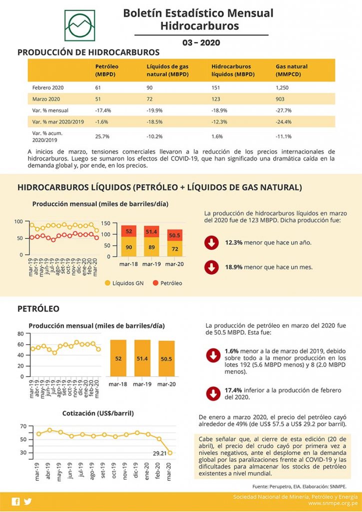 “Esto se debe principalmente a la caída en los precios internacionales y el efecto del Covid-19 en la demanda de hidrocarburos”, según informó la Sociedad Nacional de Minería, Petróleo y Energía (SNMPE) en su boletín mensual de Hidrocarburos.