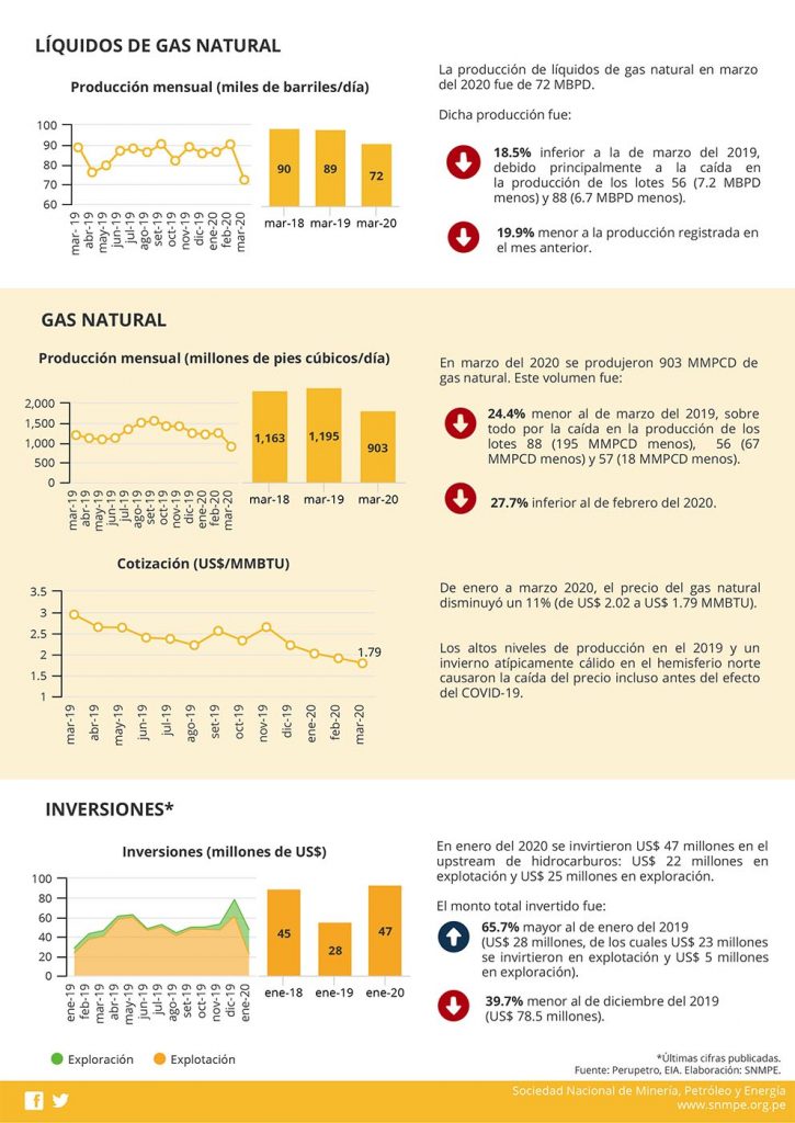 También se precisa que la producción de gas natural en el tercer mes del año fue de 903 millones de pies cúbicos por día (MMPCD), 24.4% menor a la de marzo del 2019, sobre todo por la caída en la producción de los lotes 88 (195 MMPCD menos), 56 (67 MMPCD menos) y 57 (18 MMPCD menos).