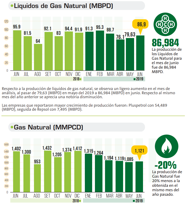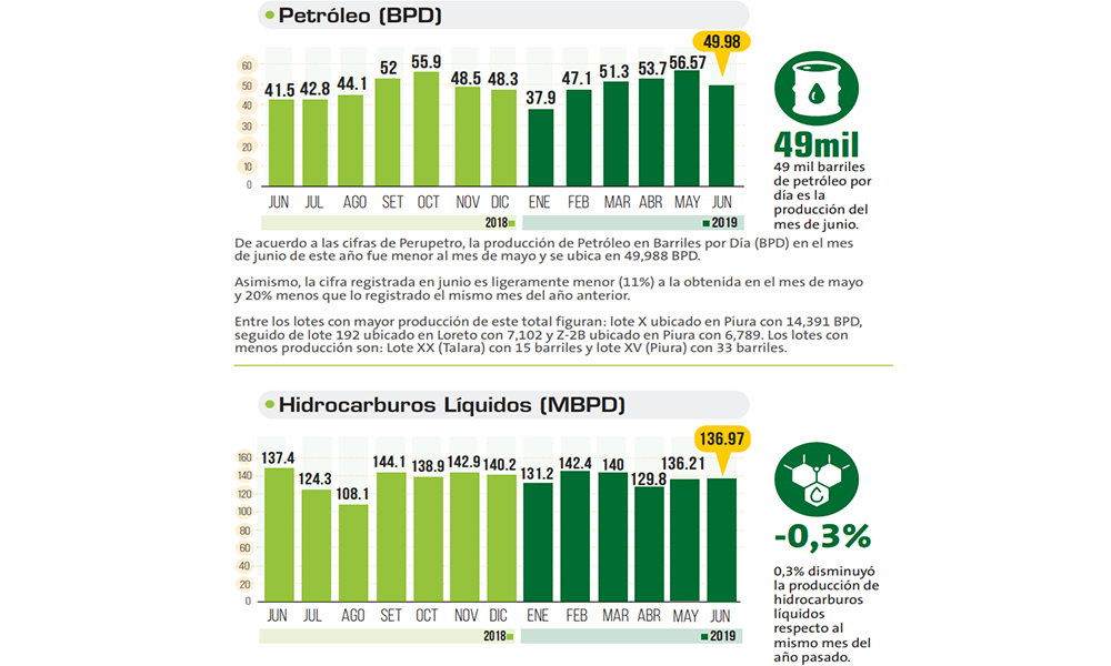 La producción de Petróleo en Barriles por Día (BPD) en junio de 2019 se ubicó en 49,988 BPD lo que significó una caída de 20% en relación al mismo mes del año pasado. Respecto a mayo de este año también hay un ligera caída. Entre los lotes con mayor producción figuran: lote X ubicado en Piura con 14,391 BPD, seguido de lote 192 ubicado en Loreto con 7,102 y Z-2B ubicado en Piura con 6,789 BPD. - Gas Natural aumenta