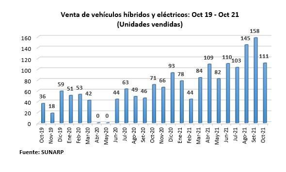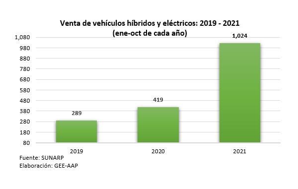 De acuerdo a información de la Superintendencia Nacional de los Registros Públicos (Sunarp), entre enero y octubre de este año se registraron 1,024 unidades vendidas de los referidos vehículos, incrementándose en 144.39% en comparación con similar periodo del año 2020, superándose por primera vez las mil unidades vendidas.