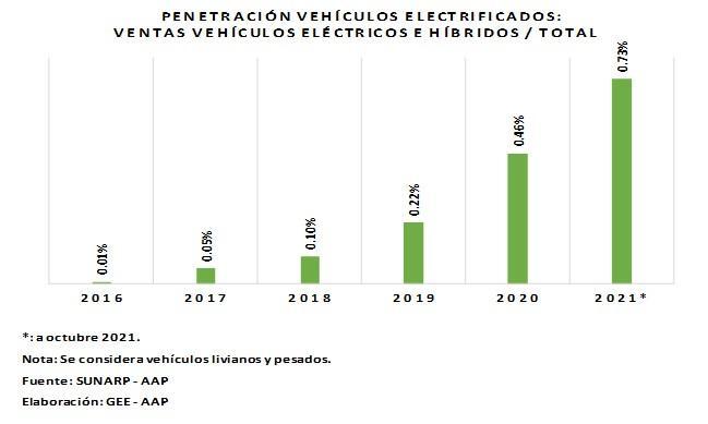 Este aumento en la venta de vehículos eco-amigables nuevos ha impulsado el porcentaje de penetración de dichos vehículos en el mercado. Así, a octubre del presente año, su participación en el total de vehículos comercializados fue de 0.73%, por encima del 0.46% del 2020 y del 0.22% del 2019. Sin embargo, “es necesario señalar que a pesar de que el mercado de vehículos electrificados viene creciendo, el tamaño sigue siendo bastante menor si lo comparamos con nuestros vecinos de la región”, apuntó Morisaki al tiempo de poner como ejemplo el caso de Colombia. “Solo en octubre, en el país del café se vendieron 2,351 vehículos de tecnologías limpias, mientras que el total de ventas en los primeros diez meses del 2021 llegó a 13,554 unidades, 13 veces más que en el mercado peruano”, apuntó.