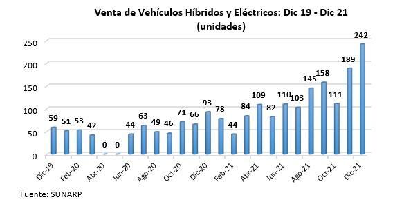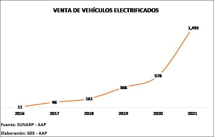 De acuerdo con información de la Superintendencia Nacional de Registros Públicos (Sunarp), la venta total de vehículos electrificados del 2021 sumó 1,455 unidades, cifra nunca antes alcanzada en el Perú.