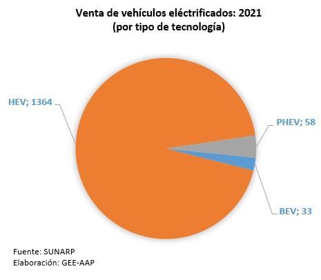 Al desagregar la información disponible, según tipo de tecnología, se observa que los vehículos eco-amigables más vendidos en el 2021 fueron los híbridos convencionales o HEV (Hybrid Electric Vehicle, por sus siglas en inglés) con 1,364 unidades, seguidos de los híbridos enchufables o PHEV (Plug-in Hybrid Electric Vehicle) con 58 unidades y más atrás se encuentran los eléctricos puros o BEV (Battery Electric Vehicle) con 33 unidades.