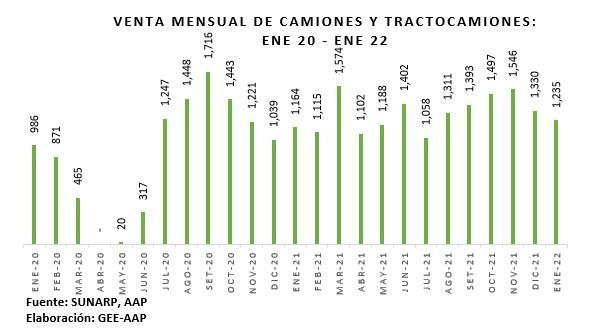 De otro lado, la comercialización de vehículos pesados registró un comportamiento dispar al inicio del 2022. En ese sentido, la venta de camiones y tractocamiones llegó a 1,235 unidades, evidenciando una expansión de 6.1% frente a enero de 2021 y de 25.3% en comparación al primer mes del 2020. El especialista de la AAP explicó que, “el crecimiento responde al mayor dinamismo de los diversos sectores económicos, tras la reducción gradual de las restricciones implementadas por el Gobierno para la contención del COVID-19. La recuperación de las actividades que requieren de estos vehículos, como minería, construcción, industria manufacturera, entre otros, ha permitido que el mercado de camiones y tractocamiones recupere sus niveles de venta observados previos al brote vírico”.