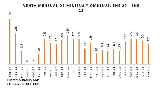 En tanto, la venta de minibús y ómnibus cerró el primer mes del 2022 con 178 unidades vendidas, cifra inferior en 19.8% y 54.9% respecto a enero del 2021 y 2020, respectivamente. El resultado reportado en el mes de análisis ha seguido la tendencia que muestra dicho segmento desde el 2021. Es cierto, acotó Morisaki que “la pandemia golpeó significativamente el sector Transporte, el mismo que se ha ido recuperando, aunque no a la misma velocidad que el resto de las actividades económicas, debido a que se mantuvieron restricciones de aforo y de circulación en casi todo el año, a nivel nacional. Dichos factores no han permitido que la demanda por buses y minibuses alcance el nivel de venta observado previo a la pandemia”.