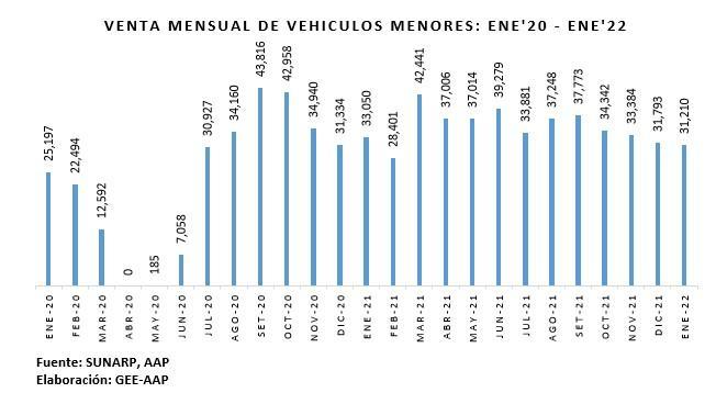 De otro lado, la venta de vehículos menores (motos y trimotos) sumó 31,210 unidades al término de enero último, número inferior en 5.6% en comparación al primer mes del 2021, aunque respecto a enero del 2020 se observó un aumento de 23.9%.
