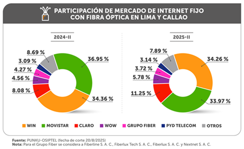 WIN, marcó un hito en el sector telecomunicaciones al convertirse en el operador con mayor participación de mercado de internet fijo con fibra óptica en Lima y Callao, de acuerdo con el último reporte del Organismo Supervisor de Inversión Privada en Telecomunicaciones (OSIPTEL).